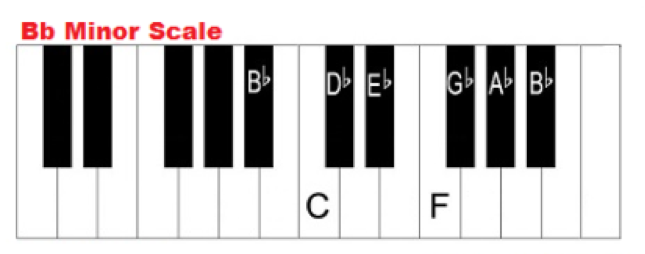 Well, it can be because the pattern of the notes for a minor scale just happen to slot into the white keys when we take the scale’s starting note, or tonic note as A. If we were to look at a minor scale starting on the next note up, we would see the application of that pattern starting on a B ♭: